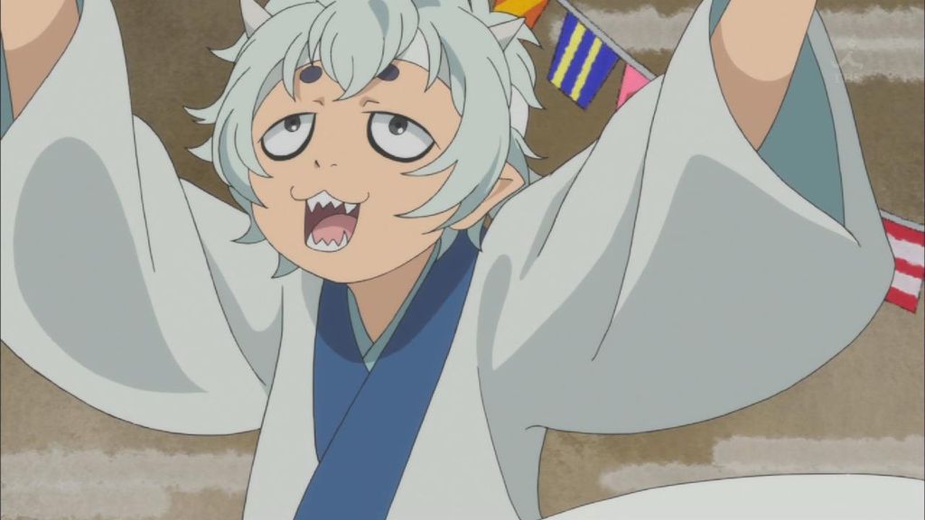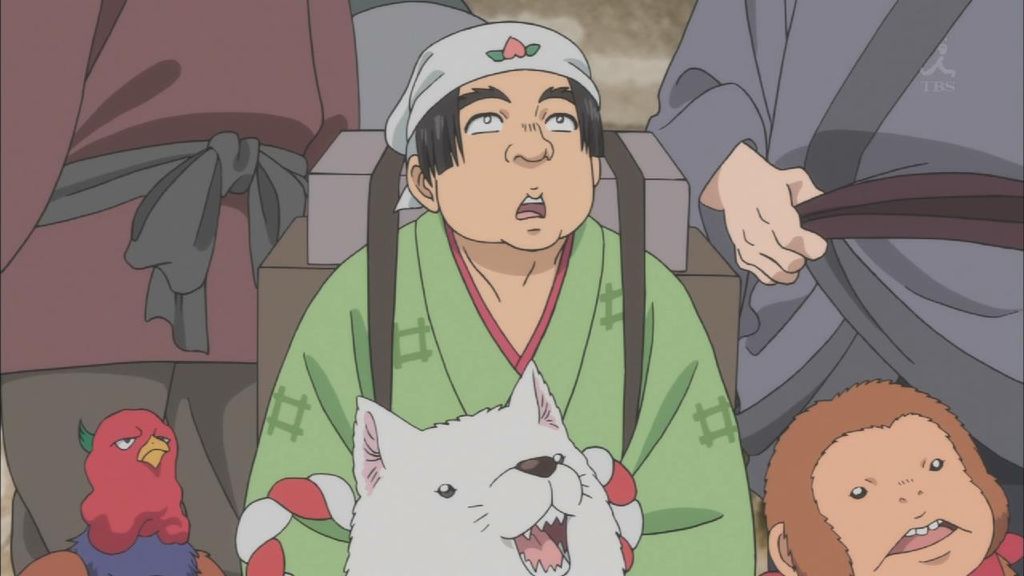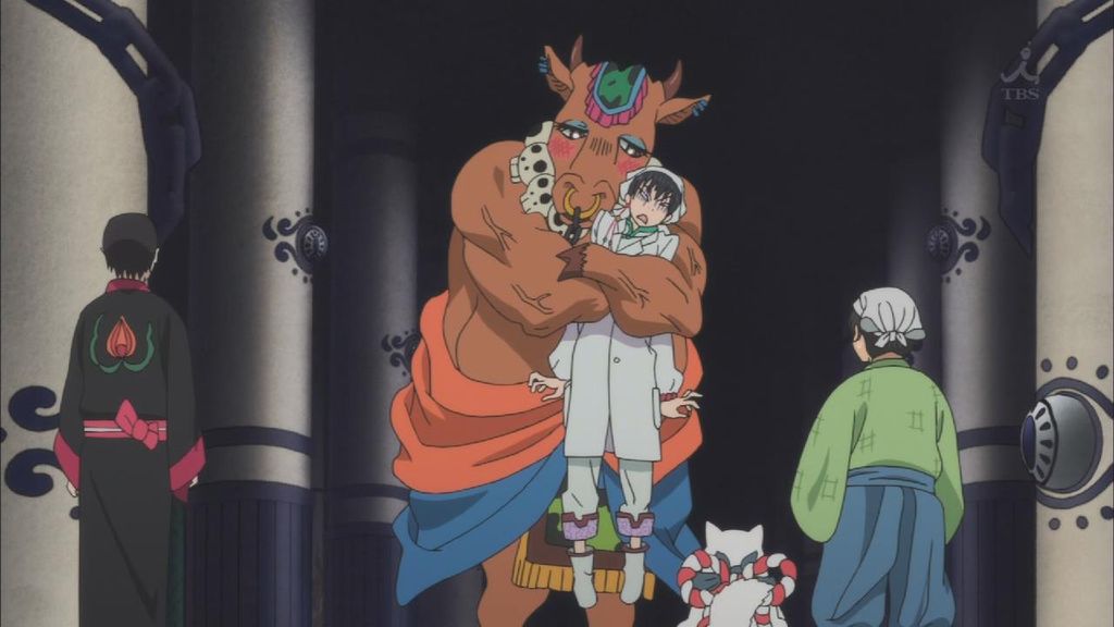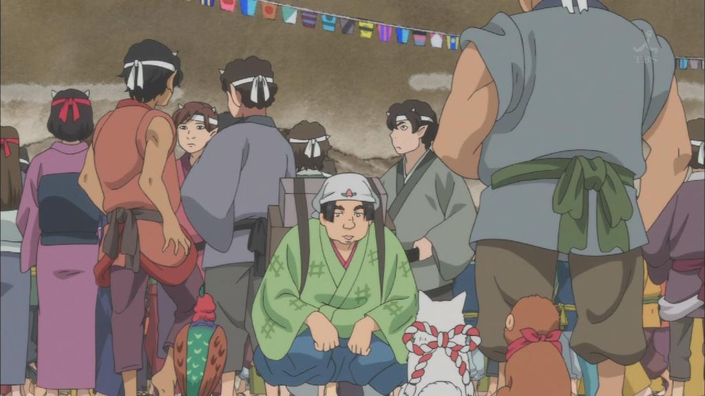 白澤とやってくる桃太郎を見つけて駆け寄るシロ・柿助・ルリオ。